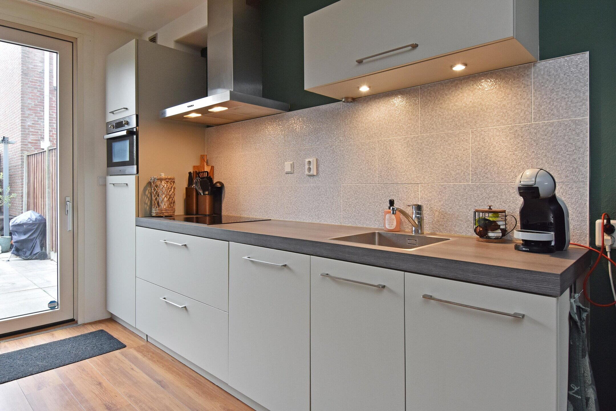 De keuken is netjes uitgevoerd en voorzien van diverse inbouwapparatuur, waaronder een combi-oven, inductiekookplaat en vaatwasser. Vanuit de woonkamer/keuken is de tweede hal bereikbaar, waar zich de trapopgang naar de verdiepingen bevindt evenals het separate toilet. Via de keuken is tevens de achtertuin toegankelijk, deze is gelegen op het westen en beschikt over een aangebouwde stenen berging en een praktische achterom, wat het dagelijks gebruik extra comfortabel maakt.