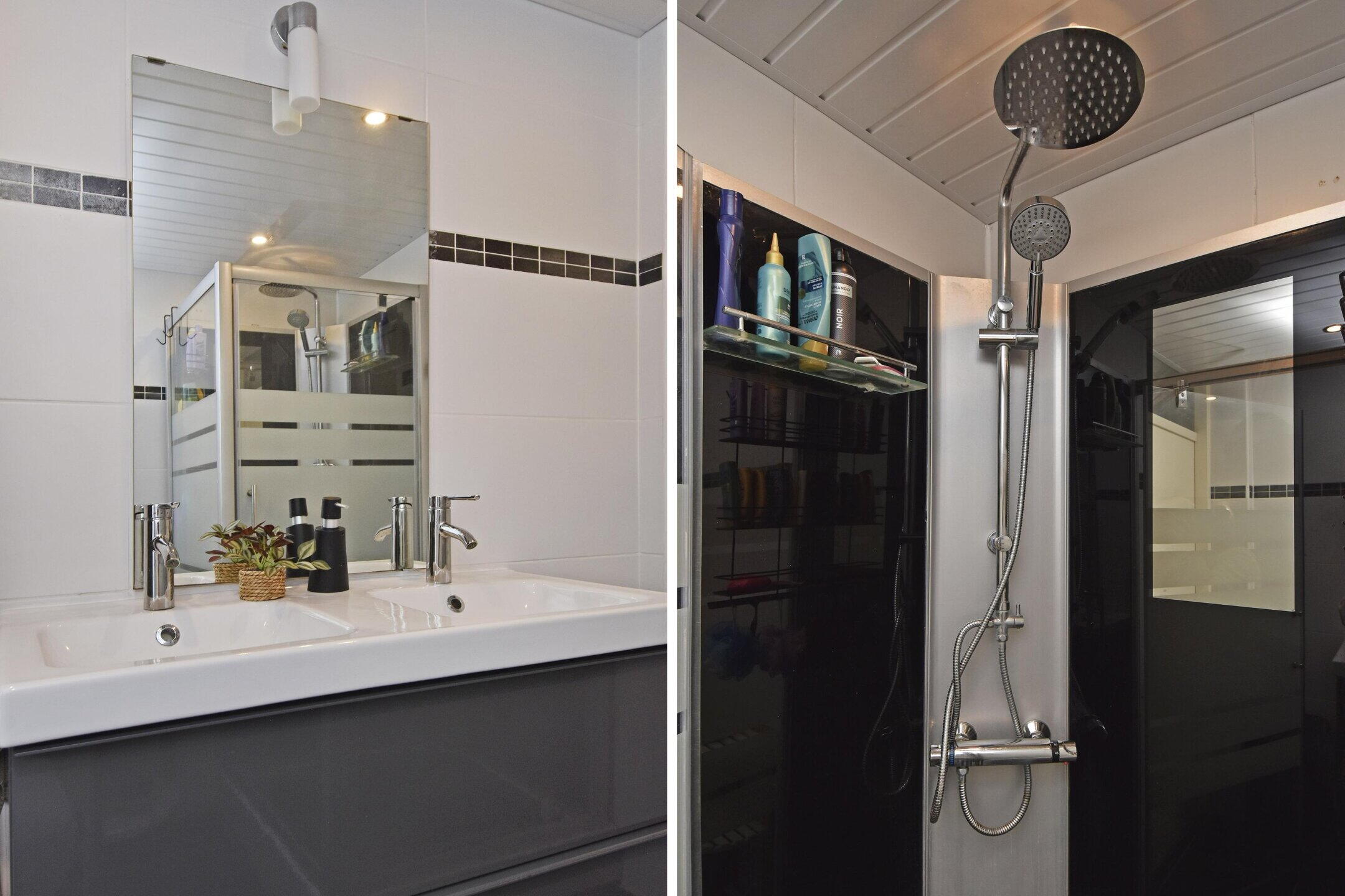 - Toilet, douche, dubbele wastafel, wastafelmeubel