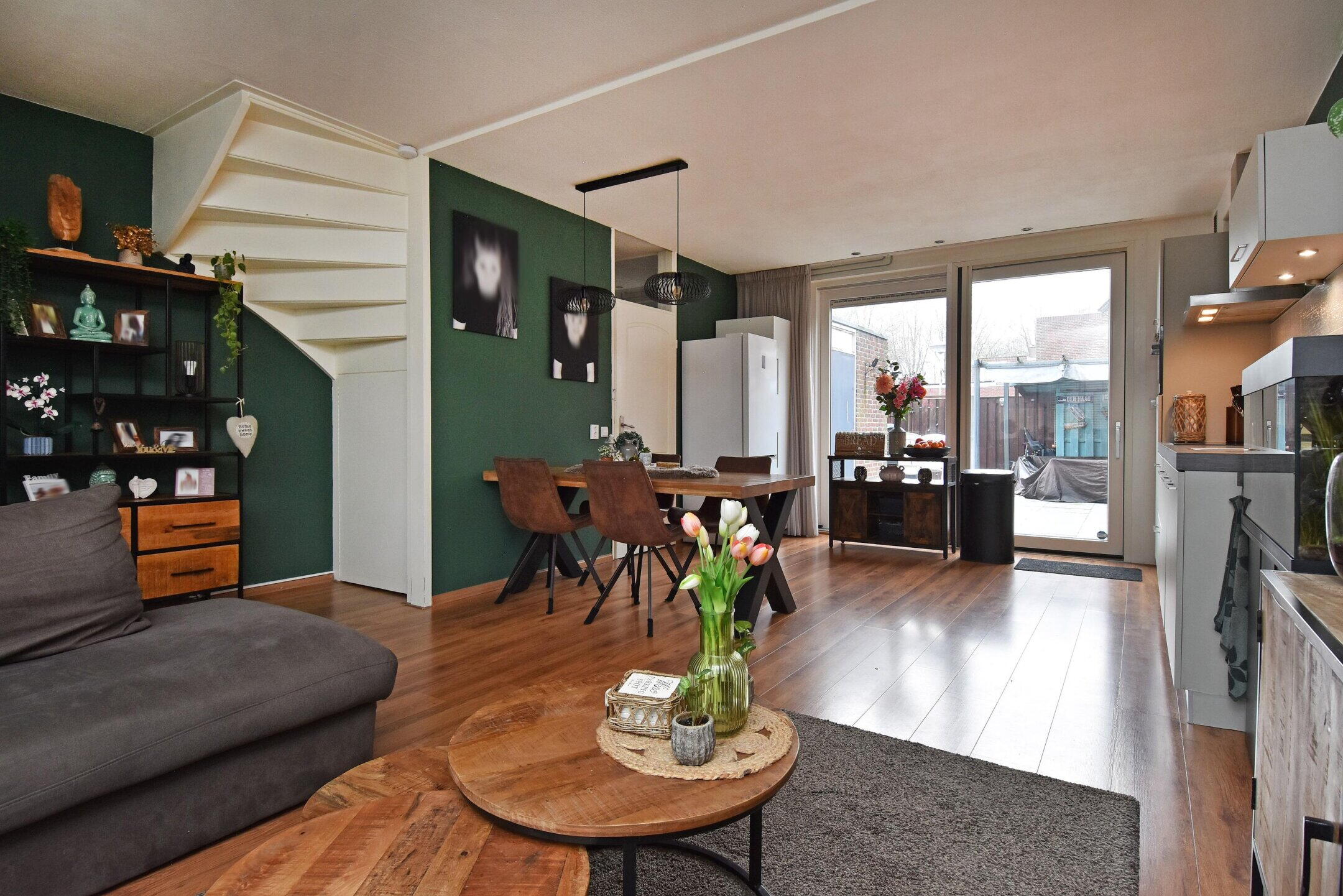 Via de voortuin betreedt u de woning en komt u binnen in de hal, die uitsluitend toegang geeft tot de woonkamer. De woonkamer is prettig ingedeeld en beschikt over een fijne lichtinval, met voldoende ruimte voor zowel een comfortabele zithoek als een eethoek. Aan de achterzijde staat de woonkamer in open verbinding met de keuken, wat zorgt voor een ruimtelijk en open geheel.